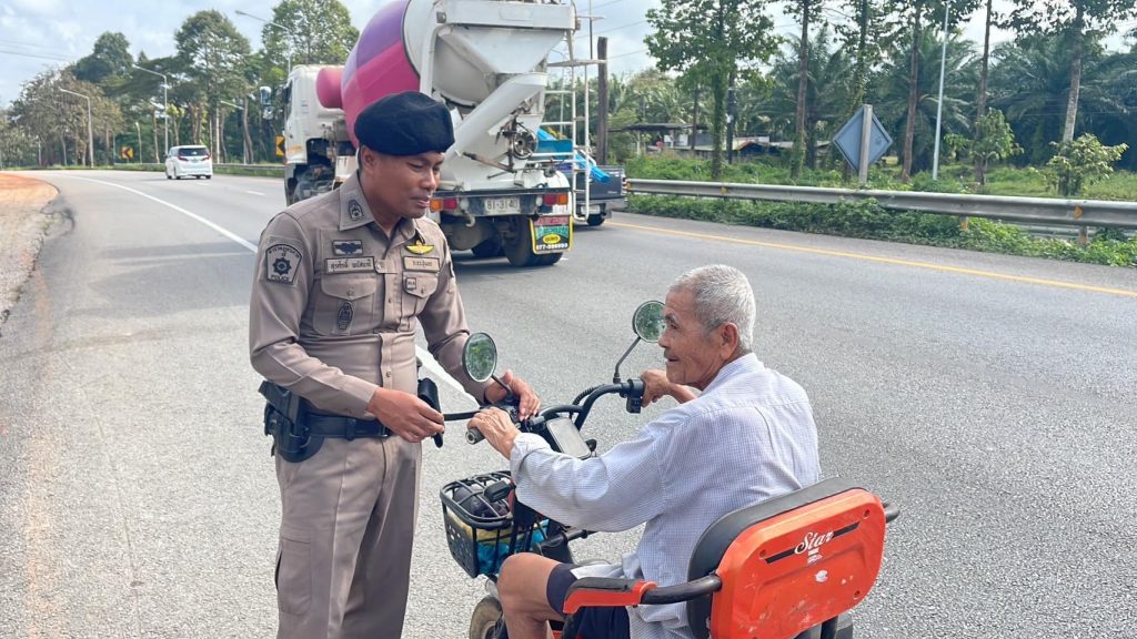 วันนี้ 31 ม.ค.67 เวลา 11.00 น.พ.ต.ท.สุรศักดิ์ พนัสนาชี สวป.สภ.ท่าแซะร.ต.ท.รุ่งเรือง สนธิเศวตรอง สว(ป).สภ.ท่าแซะ/ร้อยเวร20พร้อมด้วยด.ต.ทวีศักดิ์ แย้มลังกาสายตรวจ 221(-)ว.4 ป้องกันเหตุในพื้นที่รับผิดชอบ บนถนนเพชรเกษม(_)พบผู้สูงอายุนำรถมอเตอร์ไซต์ไฟฟ้า มาใช้บนถนนเพชรเกษม จึงได้เข้าสอบถาม และแนะนำว่าไม่ควรนำรถ มอเตอร์ไซค์ไฟฟ้า มาใช้บนถนนเส้นหลักและผู้ขับขี่เป็นผู้สูงอายุด้วย อาจจะเกิดอุบัติเหตุและมีการสูญเสียได้ ถ้ามีความจำเป็นจะต้องเดินทางไปไหนให้บุตรหลานไปส่ง